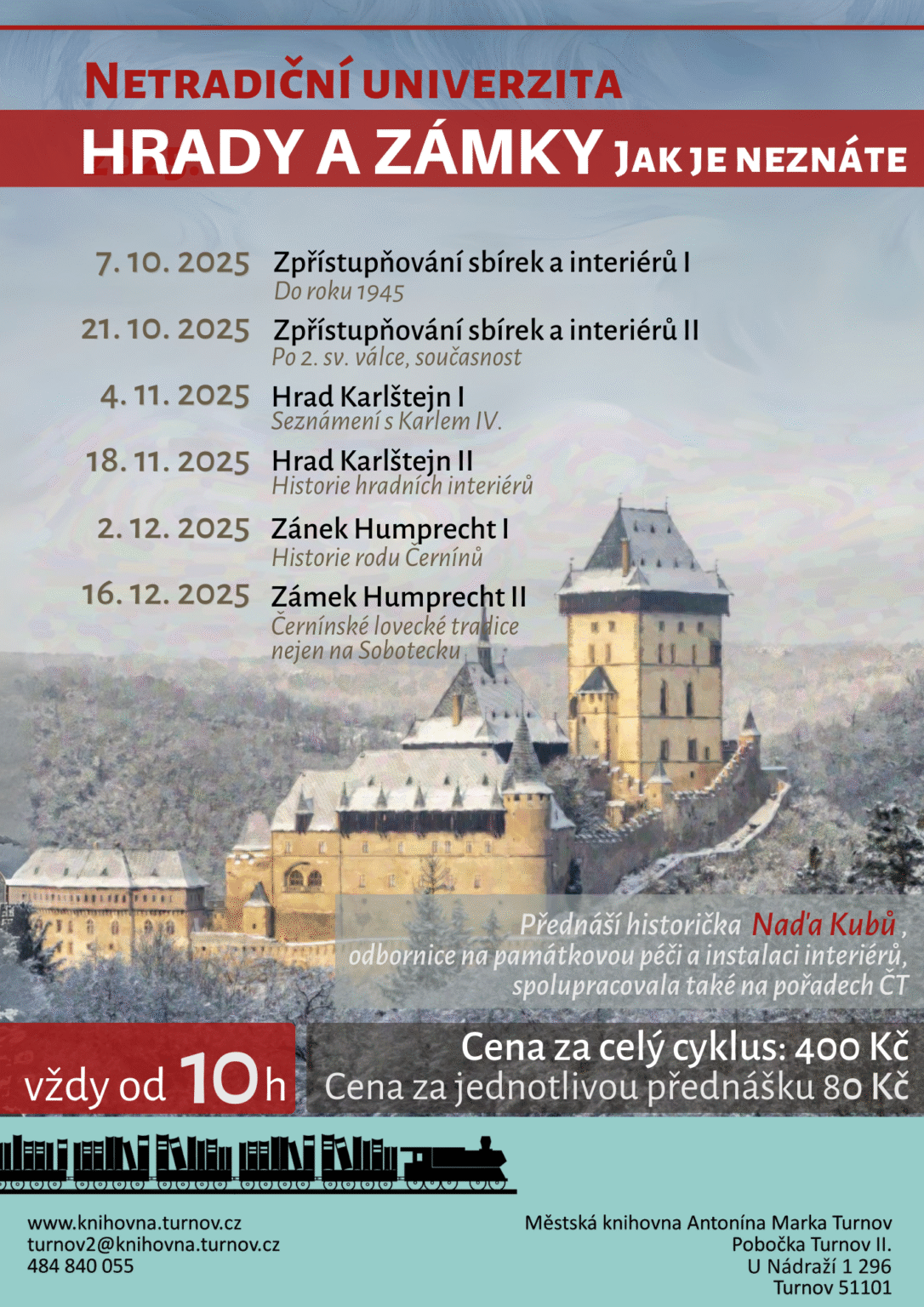 Cena celého cyklu činí 400 Kč, případně jednotlivé vstupné za přednášku 80 Kč.